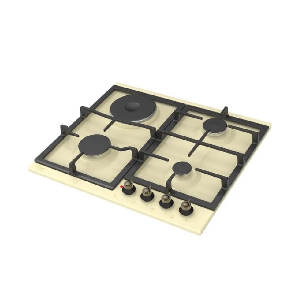 газ + электро на 4 конфорки, эмалированная сталь, автоматический электроподжиг, газ-контроль, решетки: чугун, независимая установка, размеры (ШхГ): 58x51 см