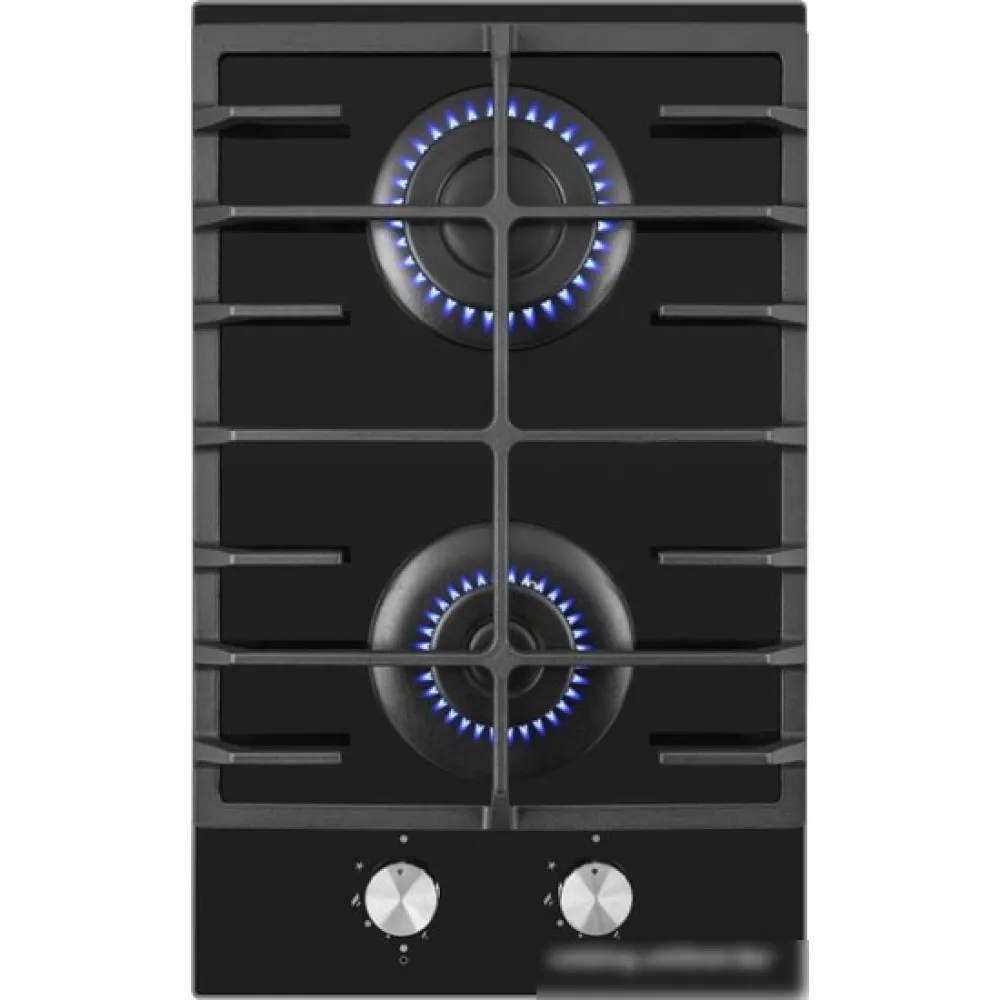 газовая на 2 конфорки, закаленное стекло, мощность: 4300 Вт, автоматический электроподжиг, газ-контроль, решетки: чугун, независимая установка, размеры (ШхГ): 29x51.5 см
