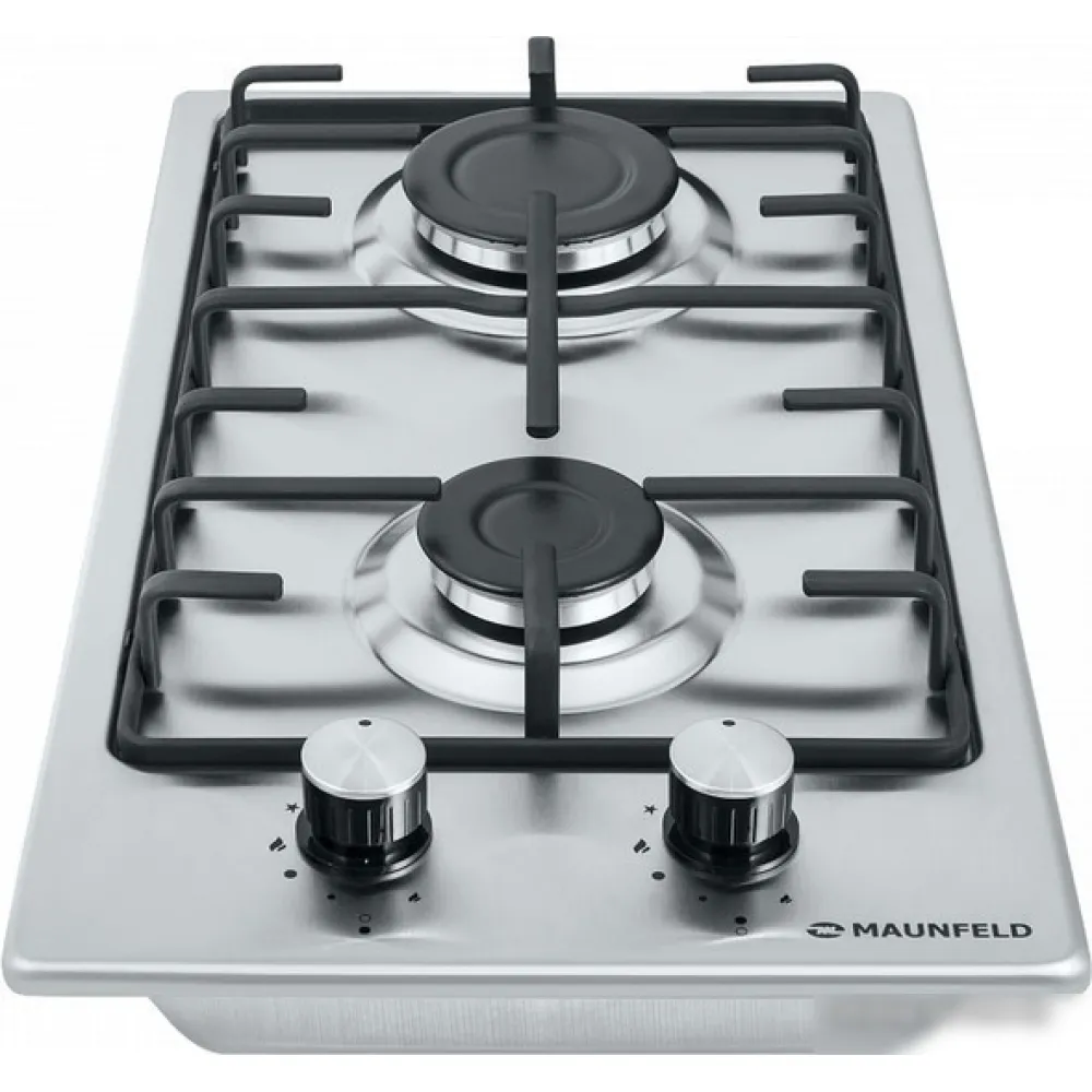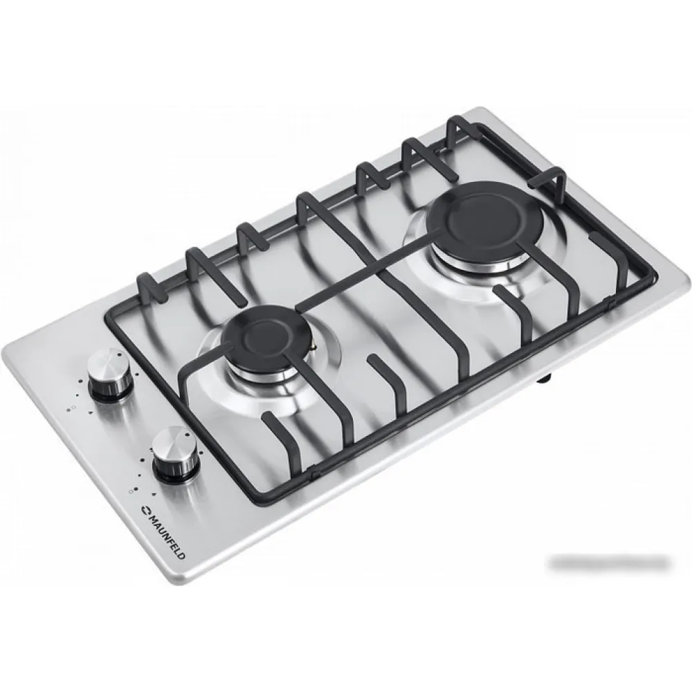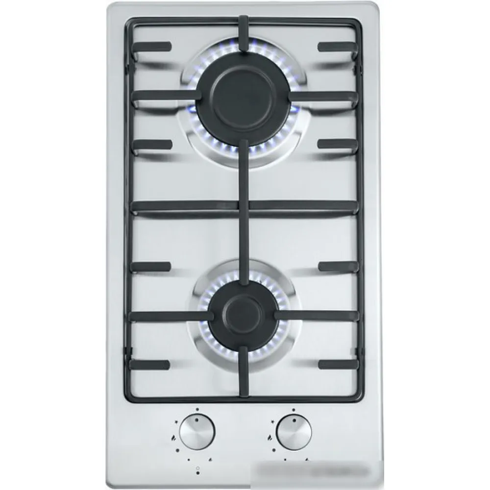 газовая на 2 конфорки, нержавеющая сталь, мощность: 4300 Вт, автоматический электроподжиг, газ-контроль, решетки: чугун, независимая установка