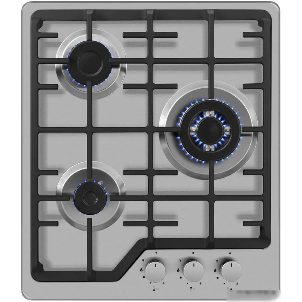 газовая на 3 конфорки, нержавеющая сталь, мощность: 5700 Вт, автоматический электроподжиг, газ-контроль, решетки: чугун, независимая установка, размеры (ШхГ): 44x51 см
