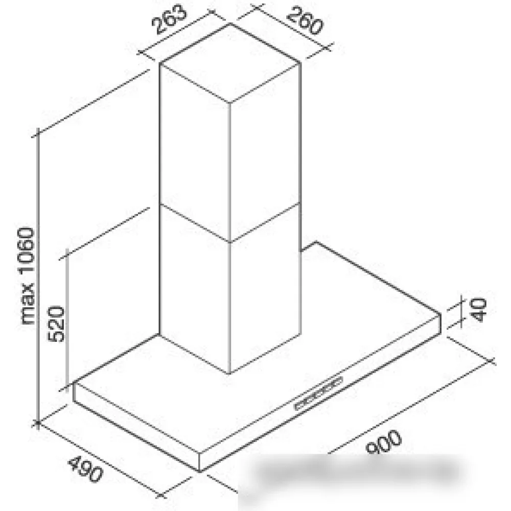конструкция Т-образная, монтаж настенный, ширина 90 см, управление электронное/кнопочное, производительность вытяжки 600 м3/ч, производительность мотора 800 м3/ч, цвет нержавеющая сталь