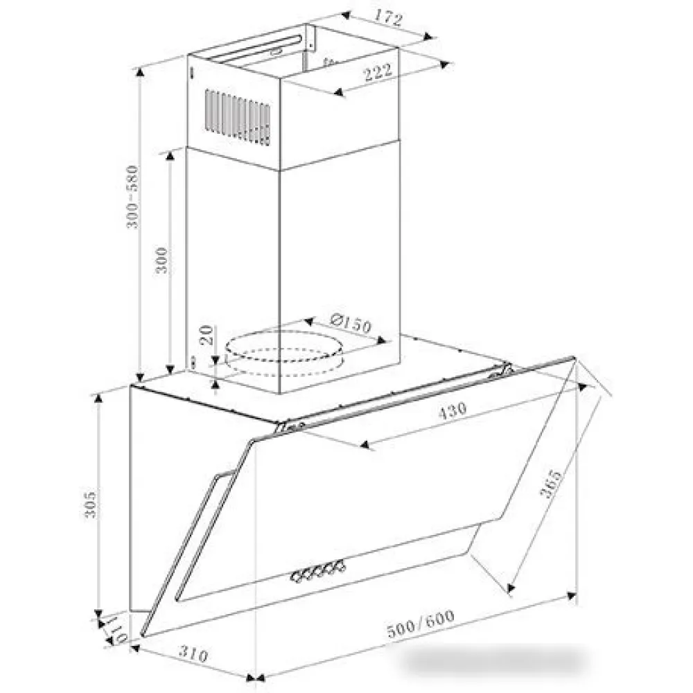 конструкция наклонная, монтаж настенный, ширина 50 см, управление механическое/кнопочное, производительность мотора 700 м?/ч, цвет черный