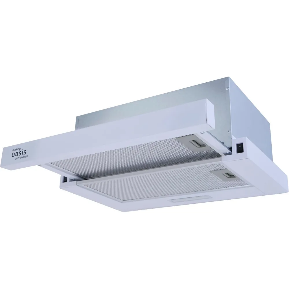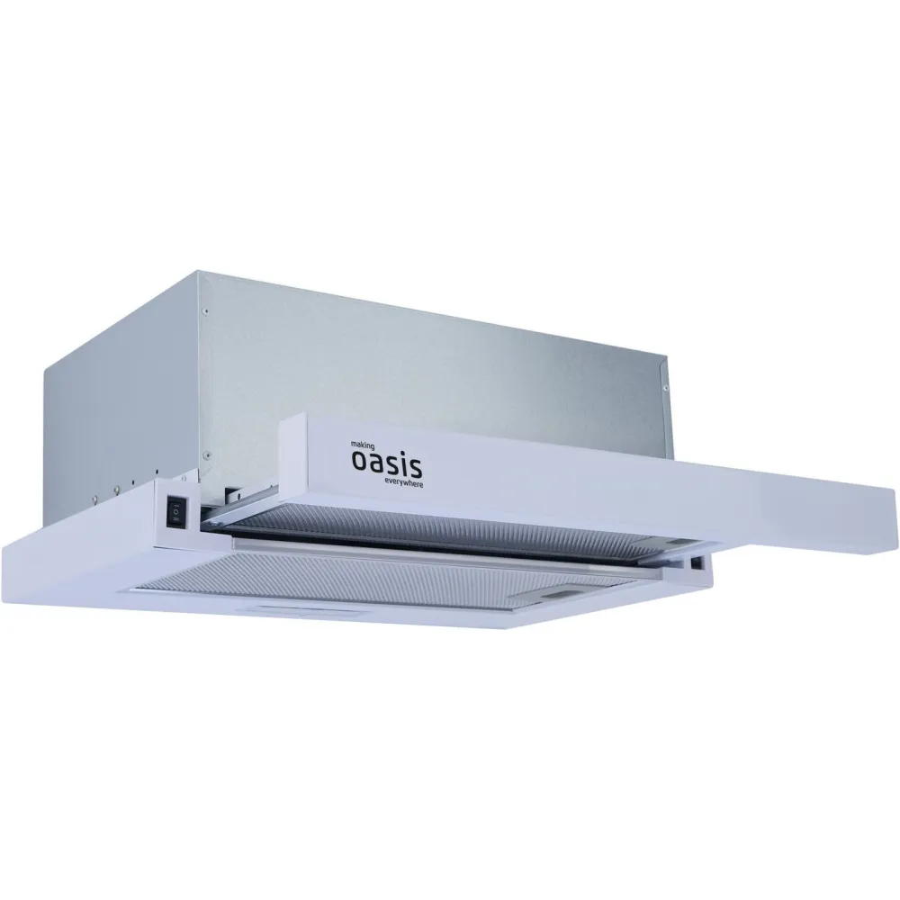 конструкция телескопическая, монтаж для встраивания, ширина 50 см, управление механическое/кнопочное, производительность мотора 500 м?/ч, цвет белый