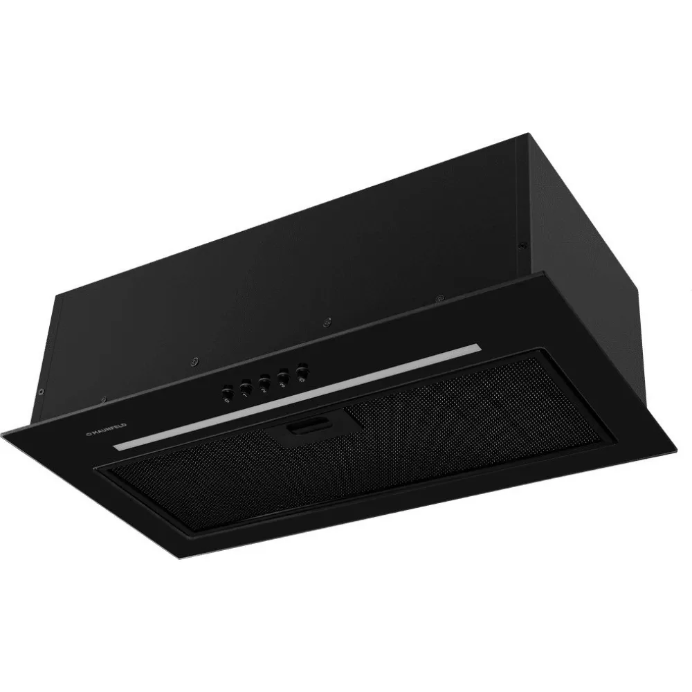 конструкция скрытая, монтаж для встраивания, ширина 55 см, управление механическое/кнопочное, производительность мотора 1000 м?/ч, цвет черный