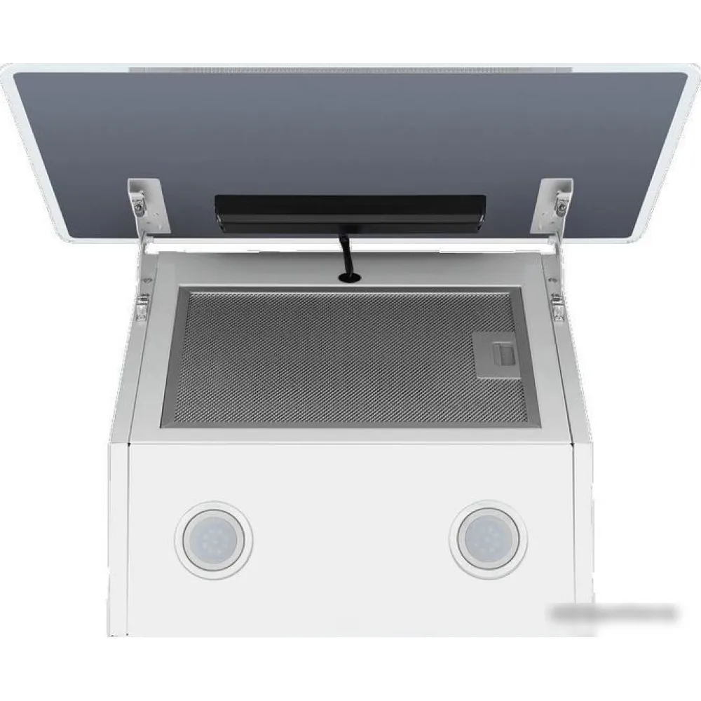 конструкция наклонная, монтаж настенный, ширина 60 см, управление сенсорное, производительность мотора 850 м?/ч, цвет белый