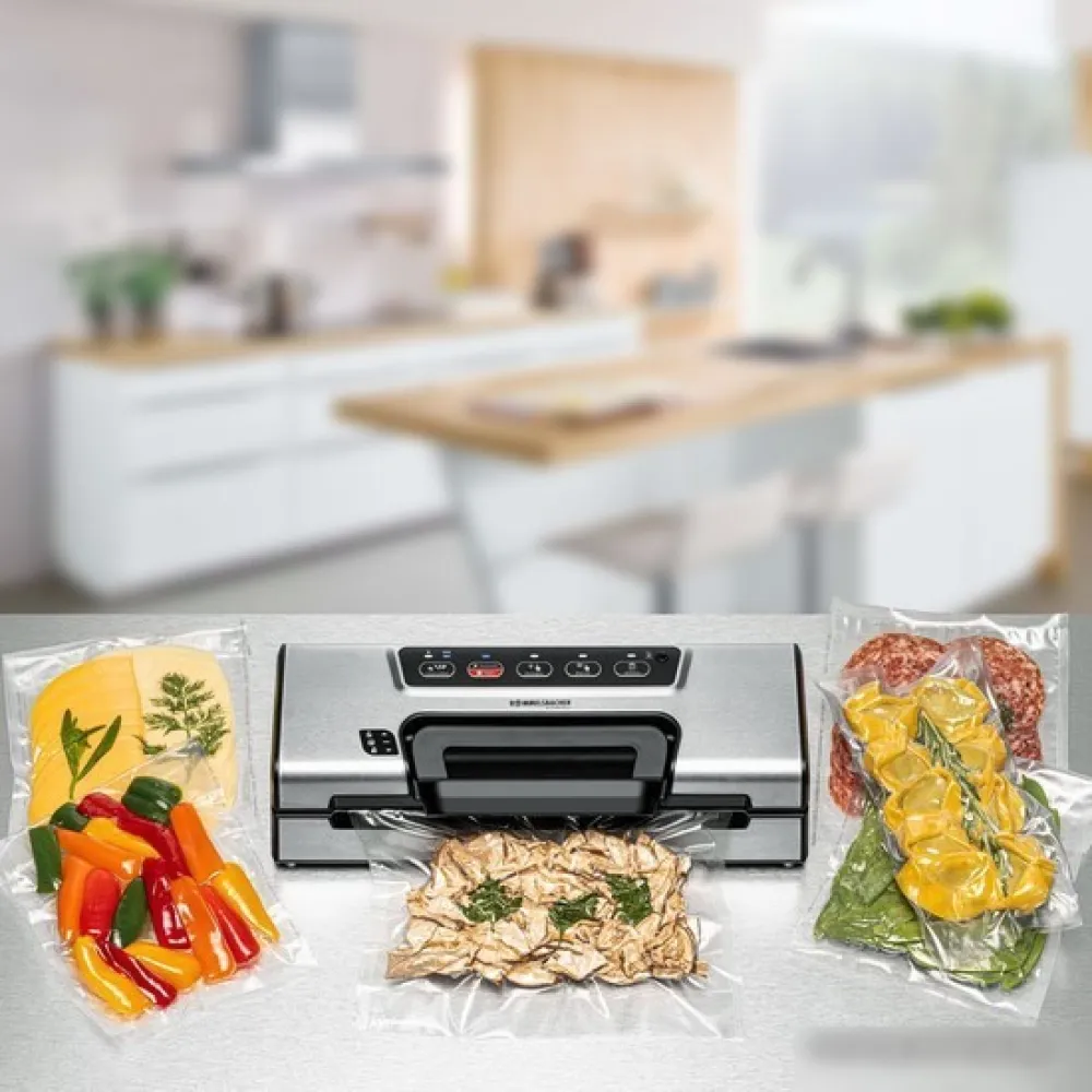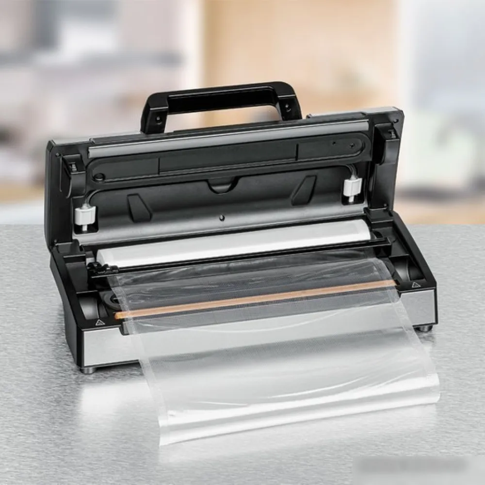 | Информация | Этот мощный вакуумный упаковщик найдет применение в каждом доме! Эту модель можно легко открыть и безопасно закрыть одной рукой без каких-либо усилий с помощью удобной ручки. Благодаря встроенному отсеку для рулона с ножом для резки необходимый рулон всегда готов к использованию. Мощный насос создает вакуум до -0,8 бар в пакетах, после чего они автоматически запечатываются прочным швом за одну операцию. Благодаря специальной функции для чувствительных и влажных продуктов вакуумирование возможно автоматически и безопасно; но также возможно ручное вакуумирование и запечатывание. Таким образом, процесс вакуумирования можно индивидуально адаптировать ко всем типам пищевых продуктов. Также возможно вакуумирование специальных контейнеров, так что даже жидкости и очень чувствительные продукты можно бережно упаковать под вакуумом и сохранить свежими в течение длительного времени. Этот вакуумный упаковщик также подходит для длительного использования, поэтому он идеально подходит для рыбаков, охотников, а также для полупрофессионального использования в небольшой гастрономии. Вакуумный упаковщик во много раз продлевает срок хранения продуктов. |