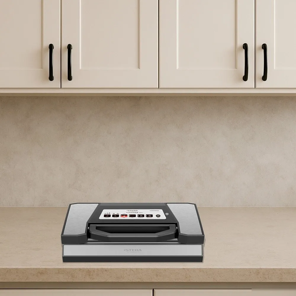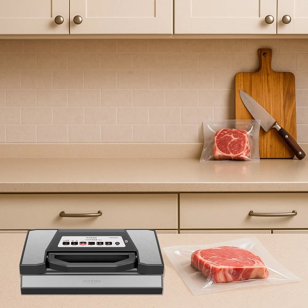 | Информация | -Вакууматор Steba VK 200 MASTER PRO - это современное устройство для вакуумирования продуктов в домашних условиях, сочетающее в себе высокую производительность и расширенный функционал. Корпус выполнен из сочетания нержавеющей стали и пластика, а удобная ручка обеспечивает легкое и надежное закрытие крышки. -Модель оснащена двумя мощными помпами, обеспечивающими скорость откачивания воздуха до 20 литров в минуту и вакуум до -0.9 бар. Для различных типов продуктов доступны режимы для сухих, влажных и нежных (импульсный режим) продуктов, а также специальная программа для маринования и функция вакуумирования жидкостей. -В Steba VK 200 MASTER PRO предусмотрен встроенный резак для пленки, отсек для хранения рулона и съемная камера сбора жидкости, что делает использование максимально удобным. Пользователь может выбрать автоматический или ручной режим запаивания, а также воспользоваться функцией откачивания воздуха из контейнеров (переходник в комплекте). -В комплект входят два рулона различной ширины и переходник для контейнеров. Ширина используемых пакетов может достигать 30 см, что позволяет вакуумировать даже крупные продукты. Электронный контроль температуры шва обеспечивает качественное и надежное запаивание, а двойной шов повышает герметичность упаковки. |