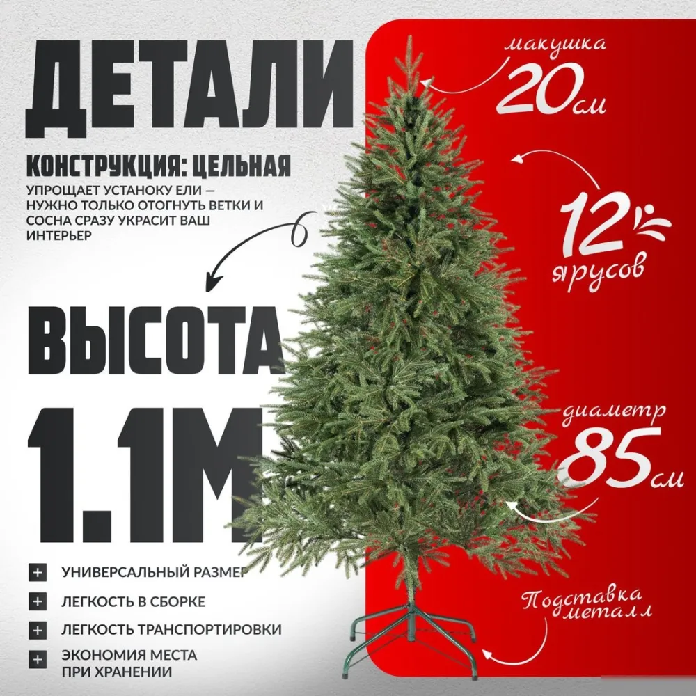 искусственная ель, литая, 1.1 м, цвет зеленый