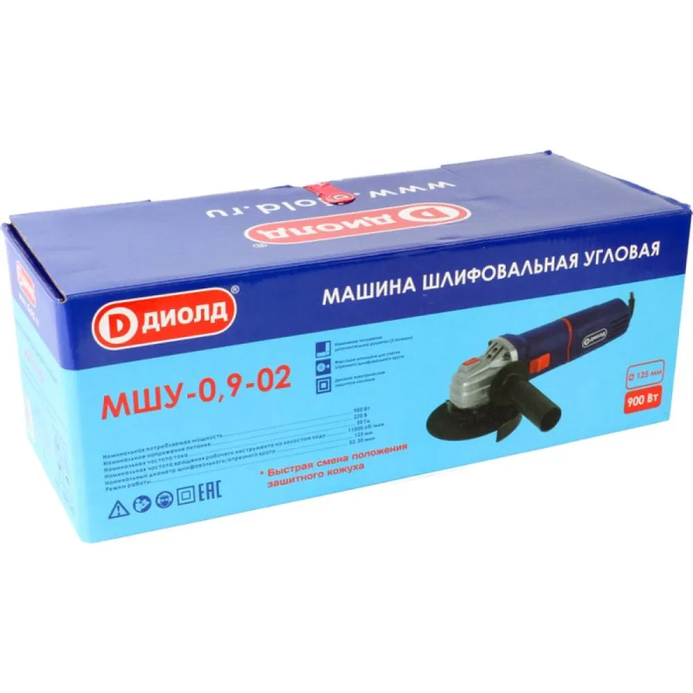 диаметр шлифкруга: 125 мм, 900 Вт, 11000 об/мин холостого хода, 1.9 кг
