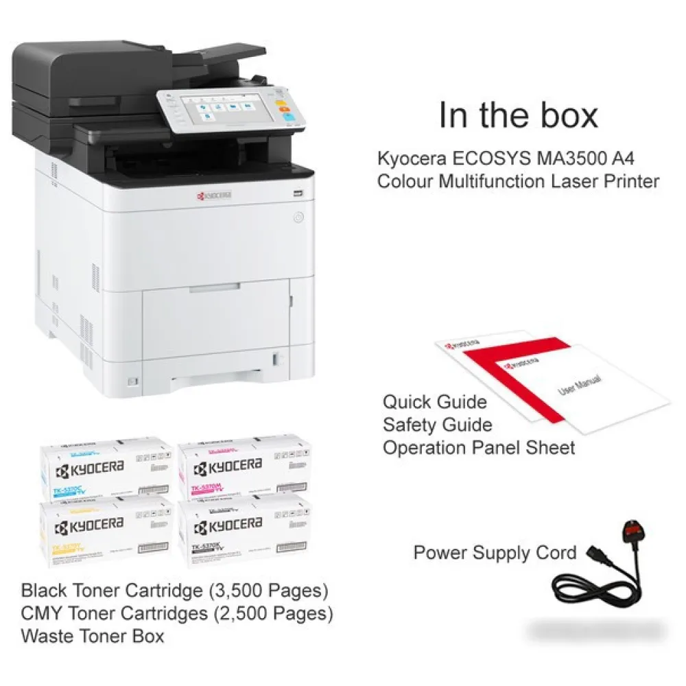 | Комплектация | Kyocera ECOSYS MA3500cix Стартовый черный картридж с тонером (3500 страниц) Стартовые цветные картриджи с тонером (2500 страниц) Ящик для отработанного тонера Краткое руководство Руководство по технике безопасности Лист панели управления Шнур питания |