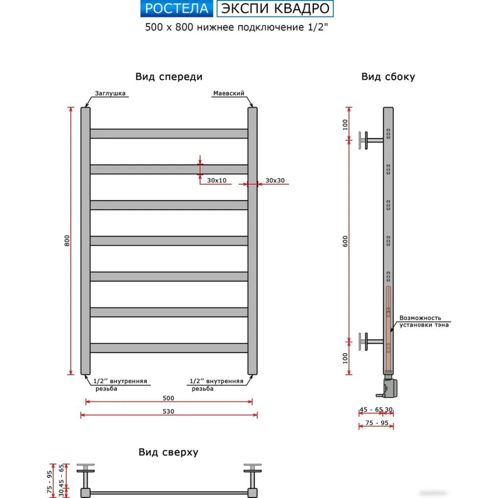 Полотенцесушитель Ростела Экспи Квадро V30 1/2" 7 перекладин 50x80 см (хром)