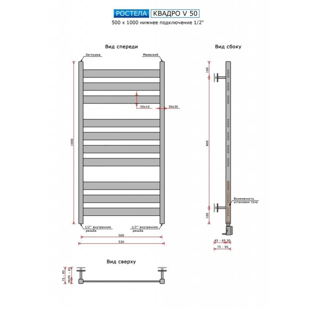 Полотенцесушитель Ростела Квадро V 50 1/2" 10 перекладин 50х60 см (черный)