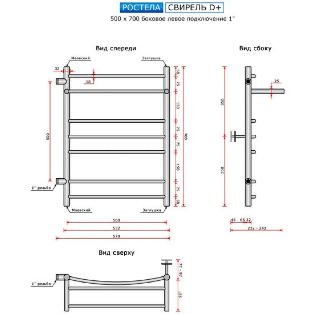Полотенцесушитель Ростела Свирель D+ боковое левое подключение 1" 50x70 см