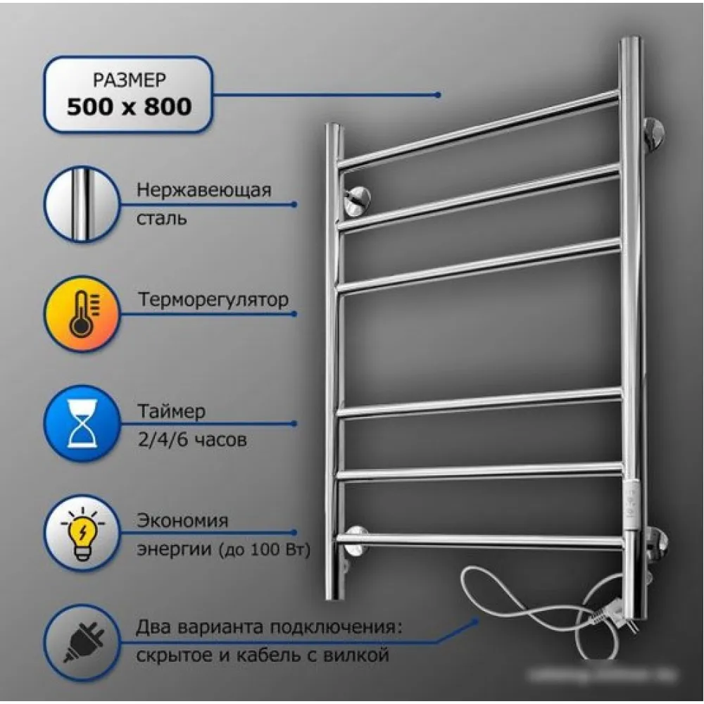 электрический, "лесенка", нержавеющая сталь, таймер, терморегулятор, 80x50 см, цвет: хром