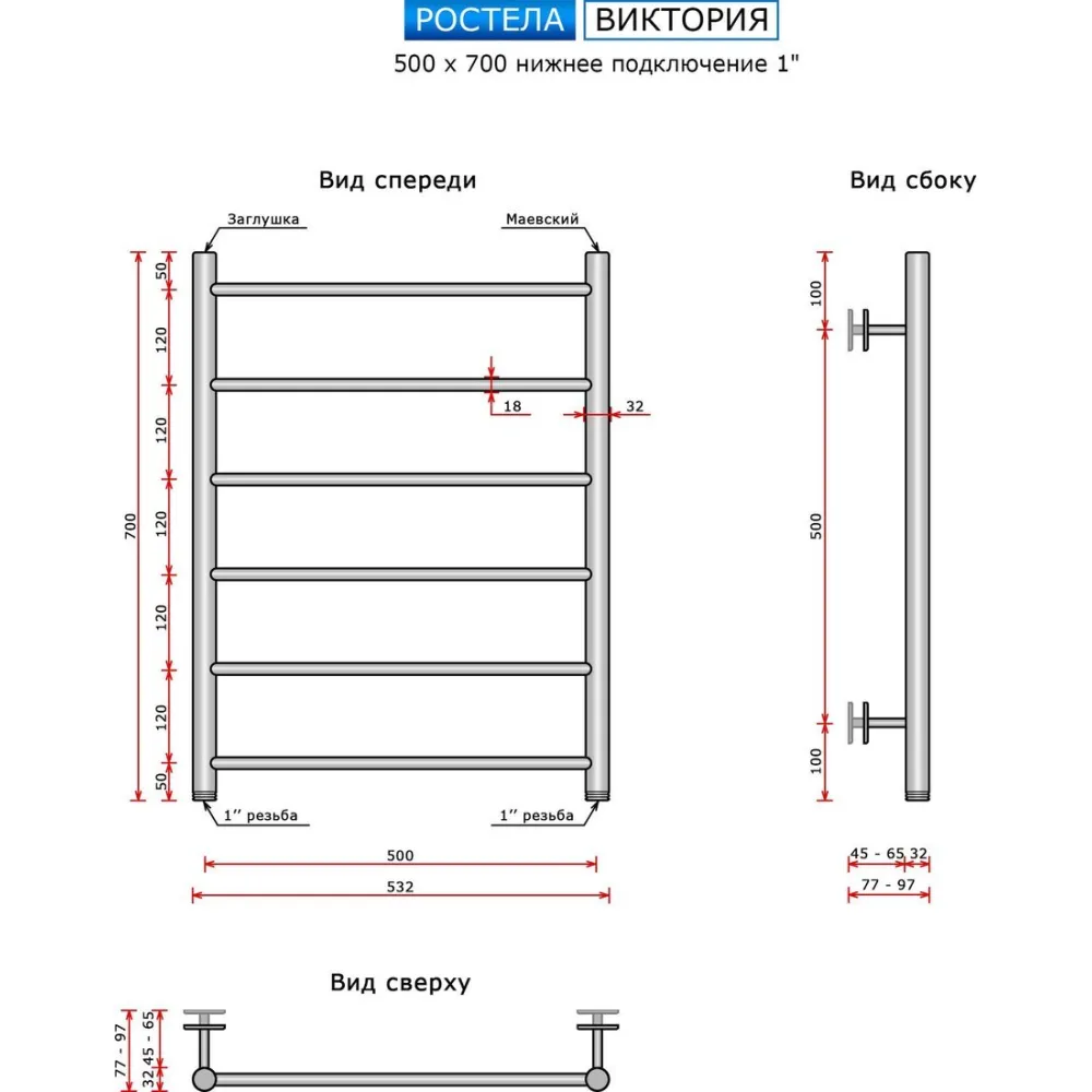 Полотенцесушитель Ростела Виктория 500x700/6 1" (Ral 9005, нижнее подключение)