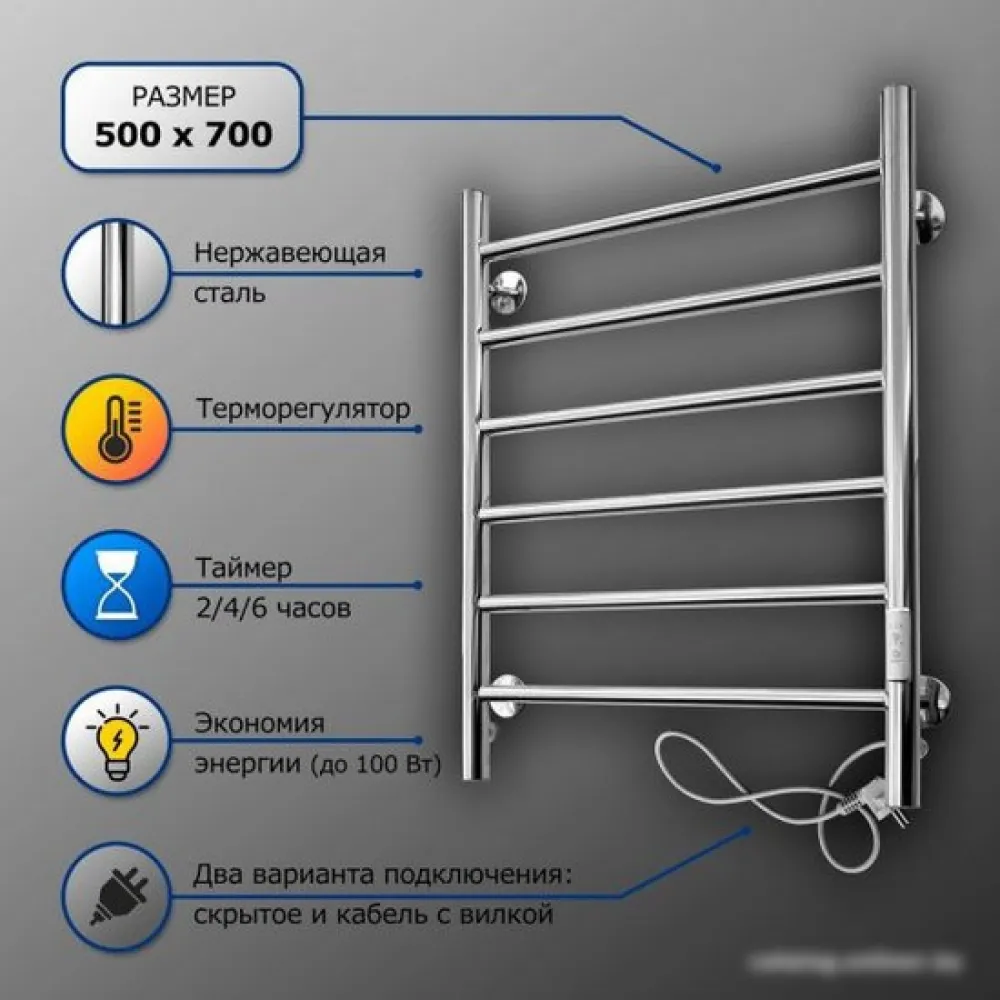 электрический, "лесенка", нержавеющая сталь, таймер, терморегулятор, 70x50 см, цвет: хром