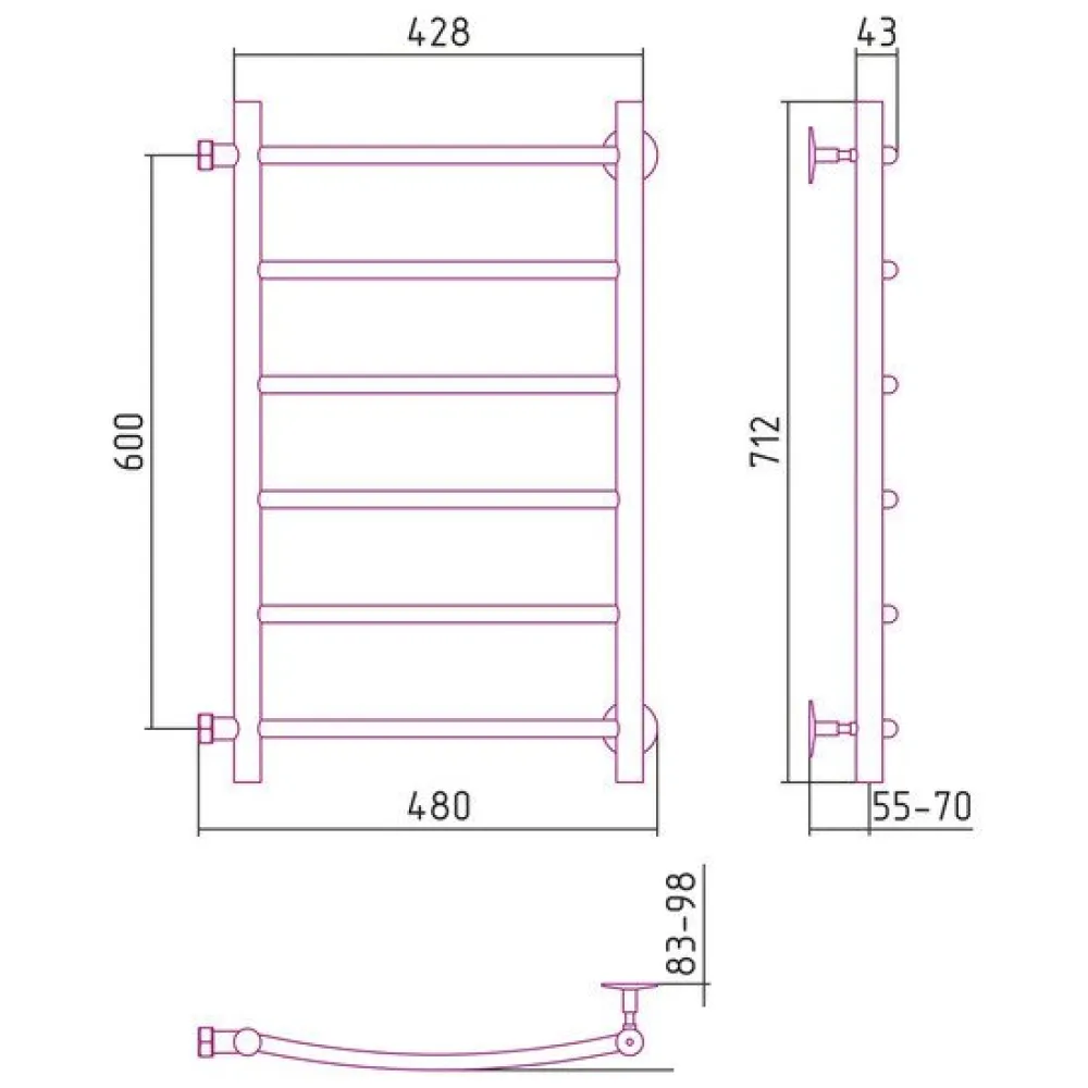 водяной, "лесенка", нержавеющая сталь, подключение боковое (600 мм, 3/4"), 71.2x48 см, цвет: хром