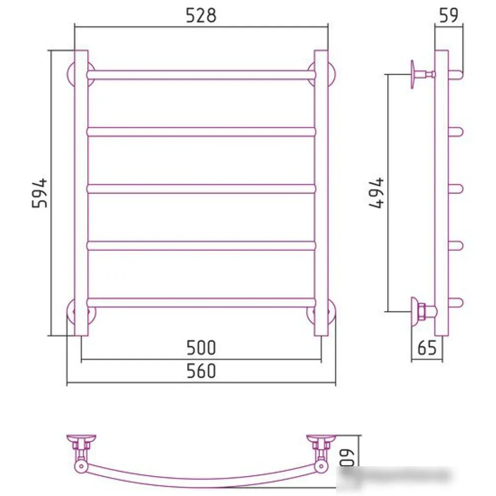 водяной, "лесенка", нержавеющая сталь, подключение нижнее (500 мм, 3/4"), 59.4x56 см, цвет: хром