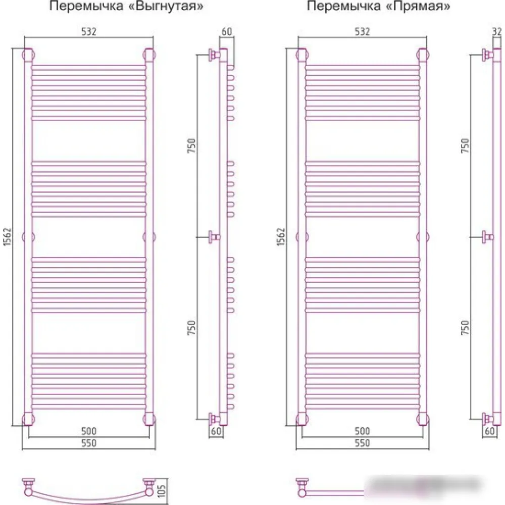 водяной, "лесенка", нержавеющая сталь, подключение нижнее/диагональное, 156.2x55 см, цвет: полированная сталь