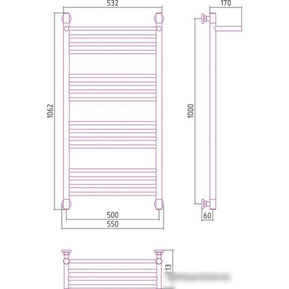 водяной, "лесенка", нержавеющая сталь, подключение нижнее/диагональное, 106.2x55 см, цвет: полированная сталь