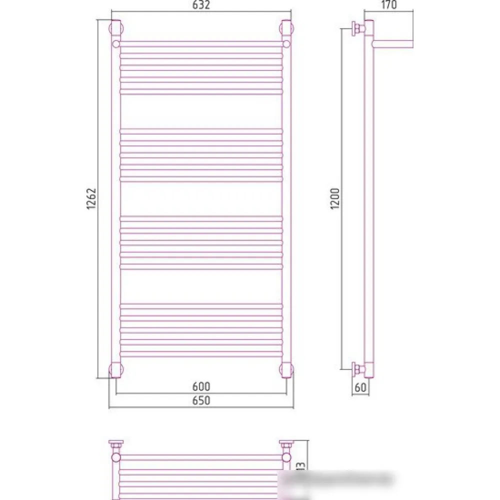 водяной, "лесенка", нержавеющая сталь, подключение нижнее/диагональное, 126.2x65 см, цвет: полированная сталь
