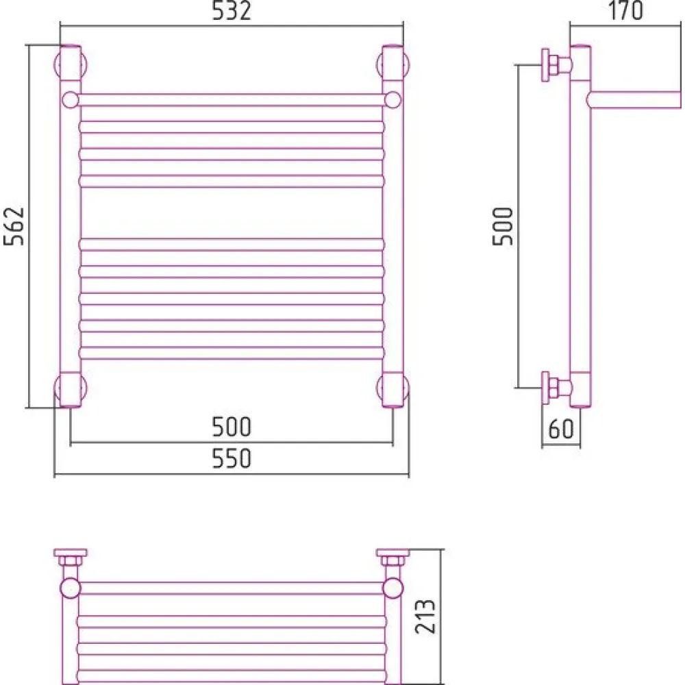 водяной, "лесенка", нержавеющая сталь, подключение нижнее/диагональное, 56.2x55 см, цвет: полированная сталь