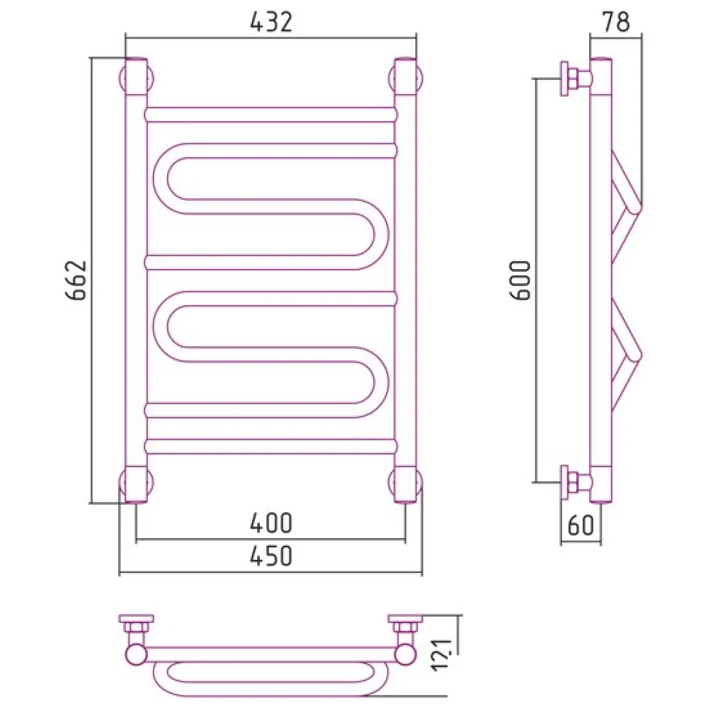 водяной, "лесенка", нержавеющая сталь, подключение нижнее/диагональное/боковое, 66.2x45 см, цвет: черный