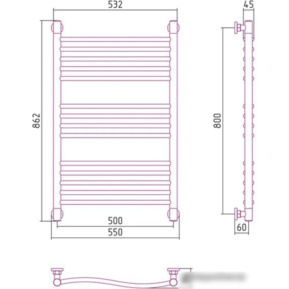 водяной, "лесенка", нержавеющая сталь, подключение боковое/нижнее/диагональное (500 мм, 1/2"), 86.2x55 см, цвет: полированная сталь