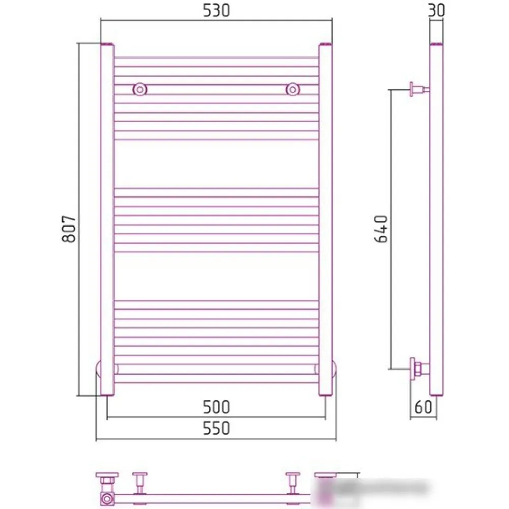водяной, "лесенка", нержавеющая сталь, подключение боковое/нижнее/диагональное (500 мм, 1/2"), 80.7x55 см, цвет: полированная сталь