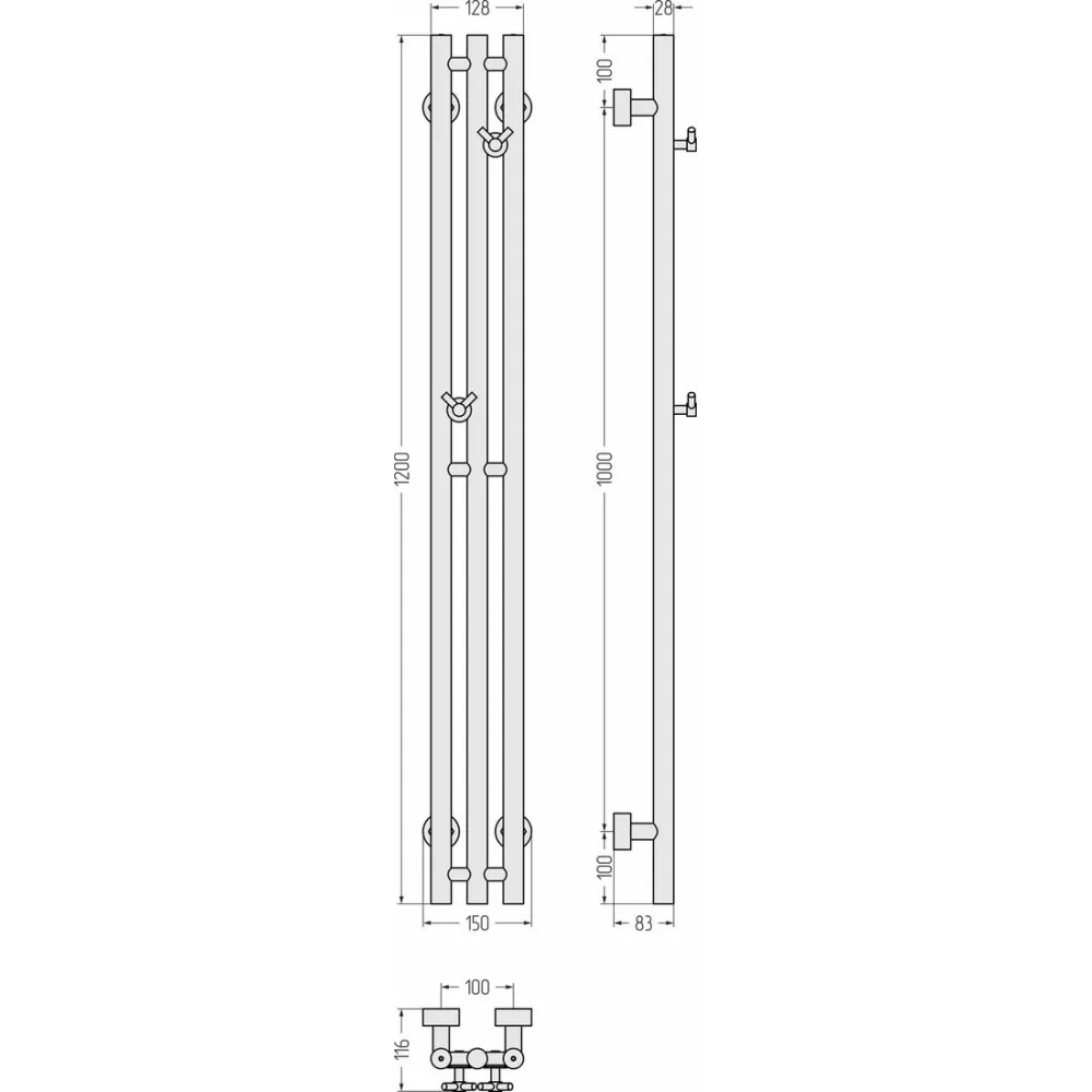 водяной, вертикальный, нержавеющая сталь, подключение нижнее/диагональное (100 мм, 1/2"), 120x15 см, цвет: черный