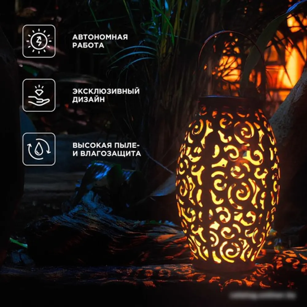 | Информация | - Садовый светильник Фенер - изысканный элемент садового декора для дополнительного освещения или акцентной подсветки. - Дизайн светильника вдохновлен богатой историей и культурой Стамбула, придавая вашему саду нотки восточной элегантности. - Оттенки и фактуры материалов в сочетании с тщательно продуманными деталями придают изделию изящный вид, создавая атмосферу загадочности. - Светильник оснащен солнечной панелью, которая поглощает солнечные лучи и преобразует их в электрическую энергию. - Накопленная энергия хранится во встроенном аккумуляторе, что позволяет светильнику автономно функционировать около 6-8 часов. |