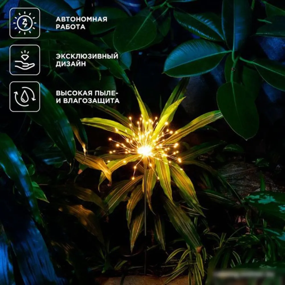 | Информация | Грунтовый светильник Салют – это изысканный элемент садового декора, предназначенный для подсветки пешеходных дорожек, тропинок, цветников, а также различных архитектурных деталей ландшафта. Дизайн светильника вдохновлен атмосферой праздничных салютов, когда небо озаряется множеством красочных огоньков. Изделие создаст не только функциональное освещение в вашем саду, но также будет радовать глаз и дарить волшебное настроение. Светильник оснащен солнечной панелью, которая поглощает солнечные лучи в течение дня и преобразует их в электрическую энергию. Накопленная энергия хранится во встроенном аккумуляторе, что позволяет светильнику автономно функционировать около 6-8 часов и освещать окружающую территорию вечером и ночью, не требуя подключения к электросети. Вечерние прогулки в саду, уютные посиделки под звездами и романтические ужины наполнятся волшебством благодаря этому особенному светильнику. |