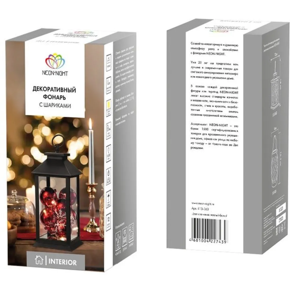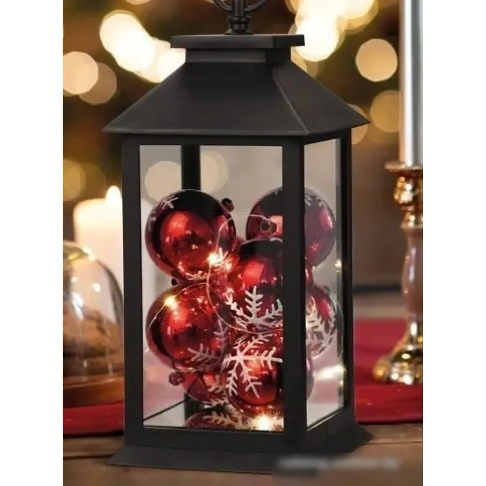 | Информация | Декоративный фонарь с шариками олицетворяет тепло и домашний уют в преддверии Нового года, помогает сделать домашние вечера в кругу семьи комфортными и поднимает настроение окружающим. Оригинальное изделие в корпусе черного цвета станет стильным дополнением праздничной обстановки. Для подвешивания предусмотрено кольцо в верхней части. Экономичные диоды, подсвечивающие композицию, излучают теплый белый свет. В качестве элементов питания используются 3 батарейки тип ААА, которые делают фонарь мобильным – для работы не нужна розетка. |
